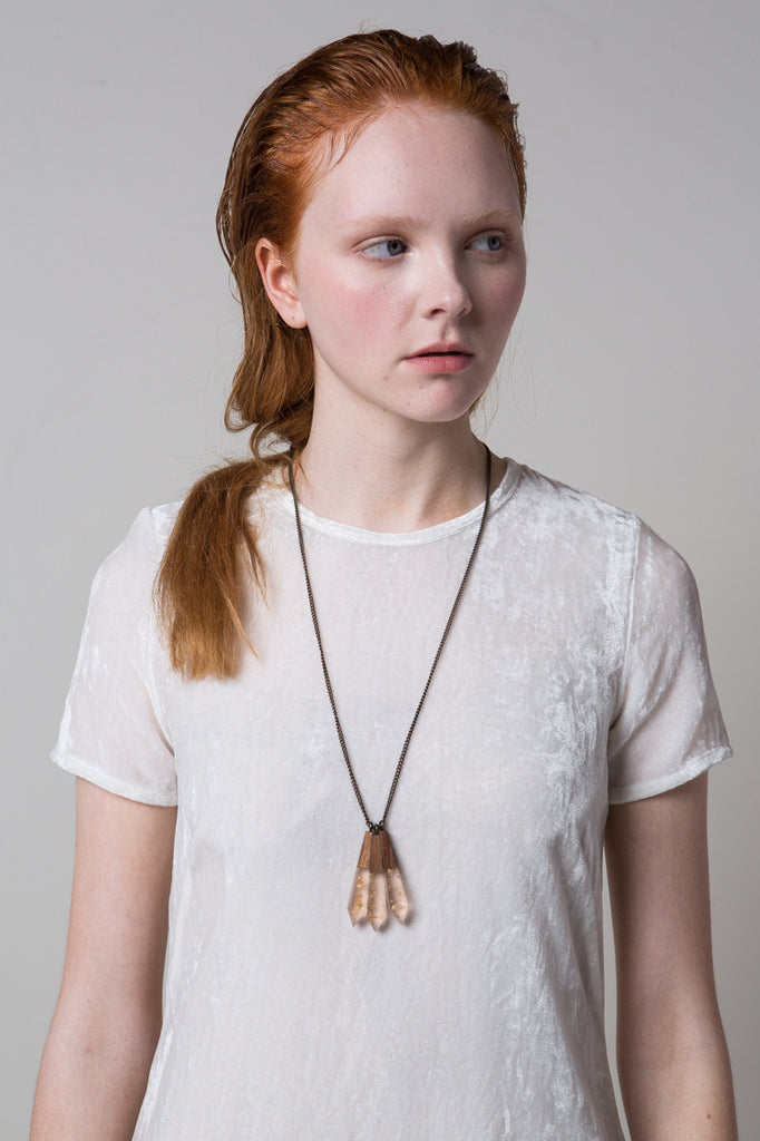 The Metallic Drop Necklace is handmade from the finest materials, coupling translucent tinted resin with suspended gold/silver leaf and sustainably-grown Rosewood