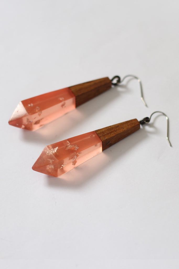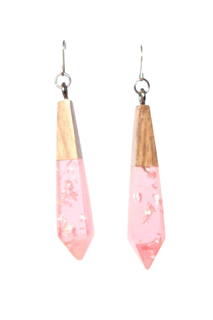 The Metallic Drop Earrings are handmade from the finest materials, coupling translucent resin with suspended gold/silver leaf and sustainably-grown Rosewood.