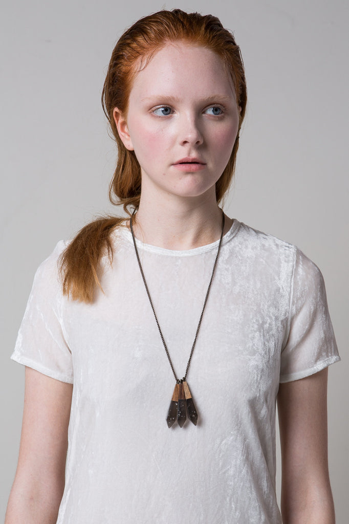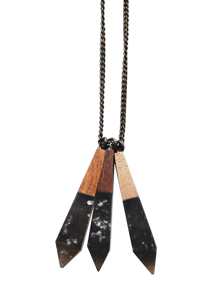The Metallic Drop Necklace is handmade from the finest materials, coupling translucent tinted resin with suspended gold/silver leaf and sustainably-grown Rosewood