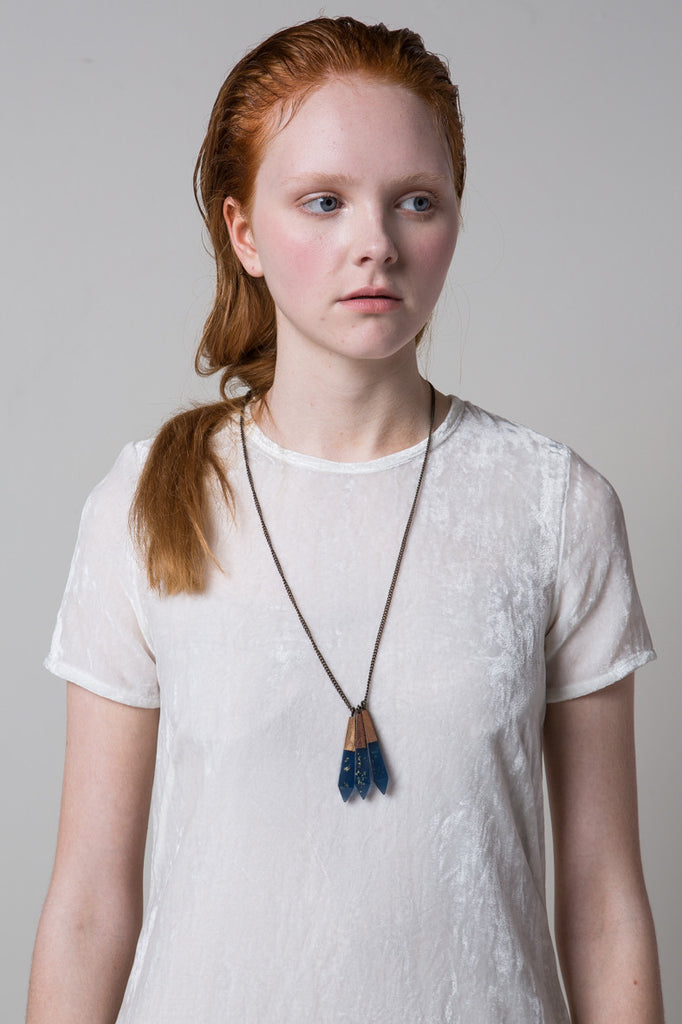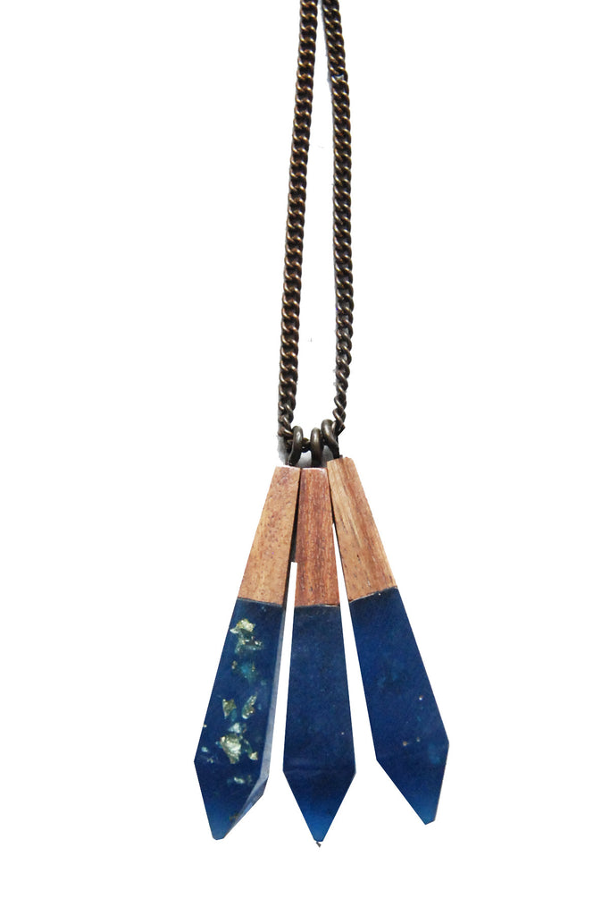 The Metallic Drop Necklace is handmade from the finest materials, coupling translucent tinted resin with suspended gold/silver leaf and sustainably-grown Rosewood