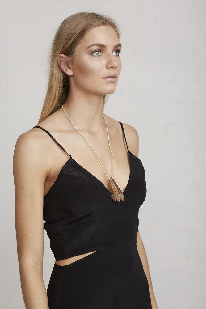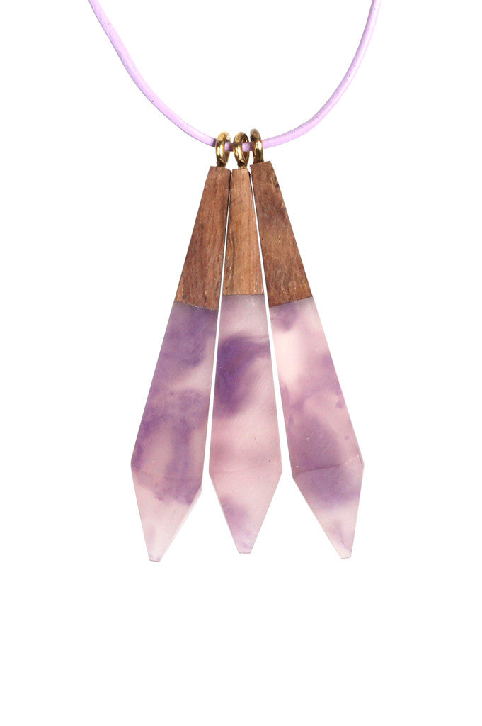 Translucent marbled resin and sustainably-grown Rosewood New Drop Necklace. Each necklace is on a leather cord that measures 37cm with a Limedrop oval and parrot clasp. Packaged in a Limedrop gift box.