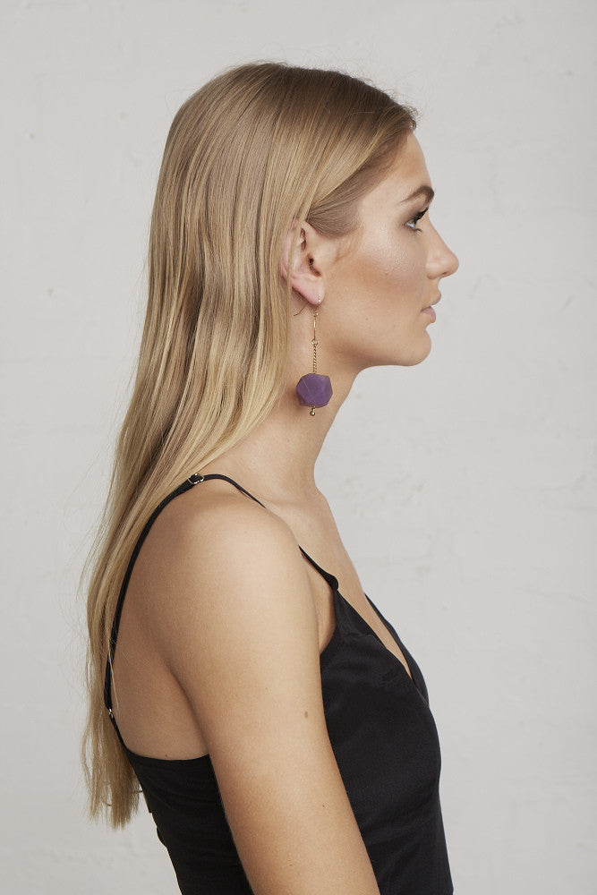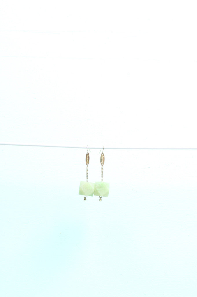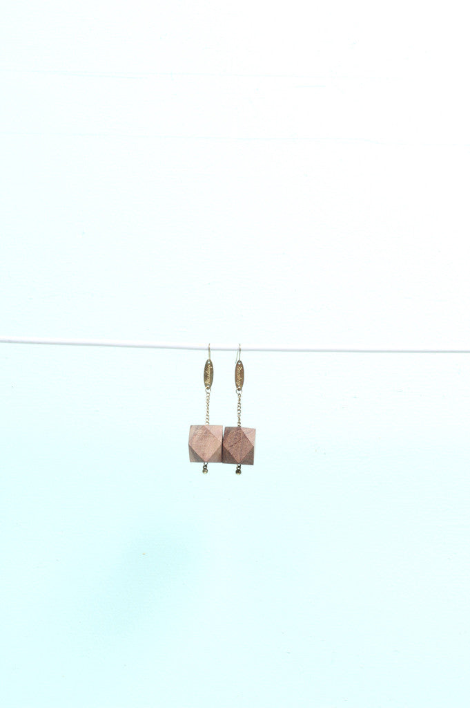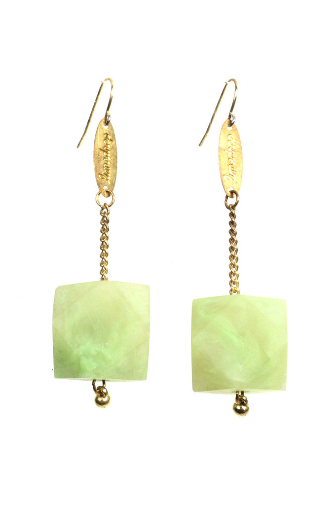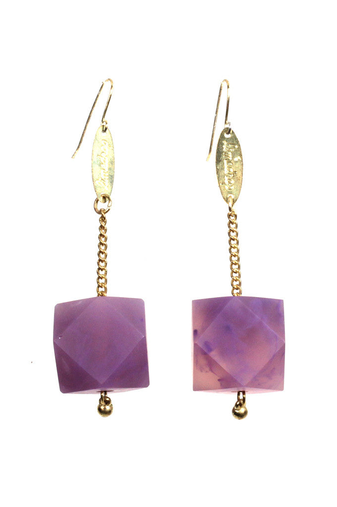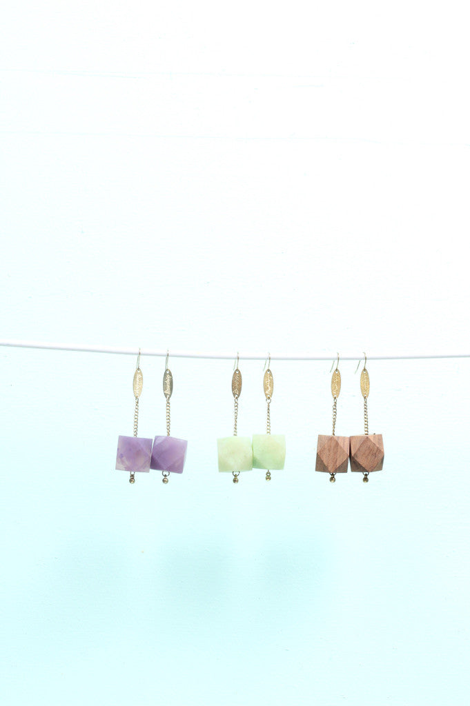 Translucent marbled resin and sustainably-grown Rosewood New Gem Earrings. These light weight hanging earring styles have surgical steel earring hooks, hanging chain/limedrop oval logos and come packaged in a Limedrop gift box.