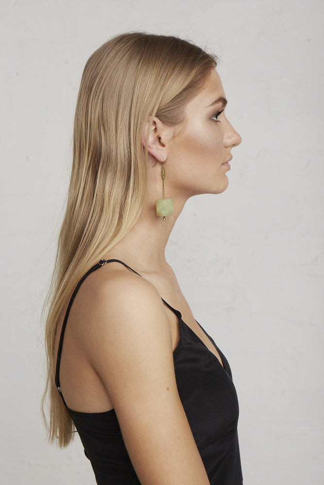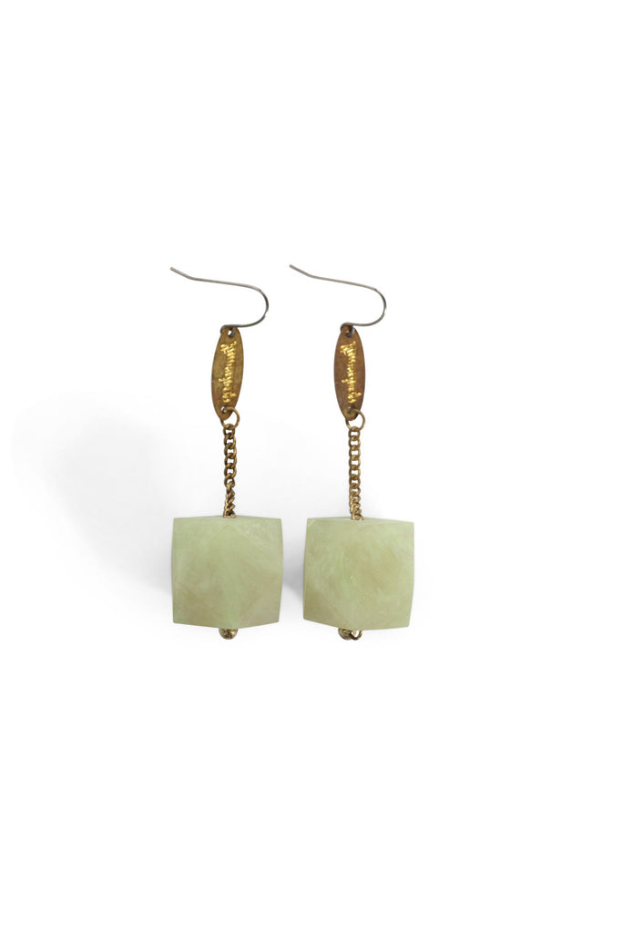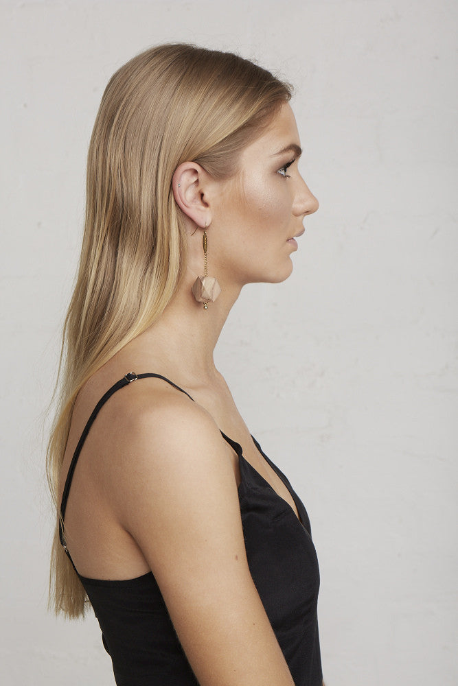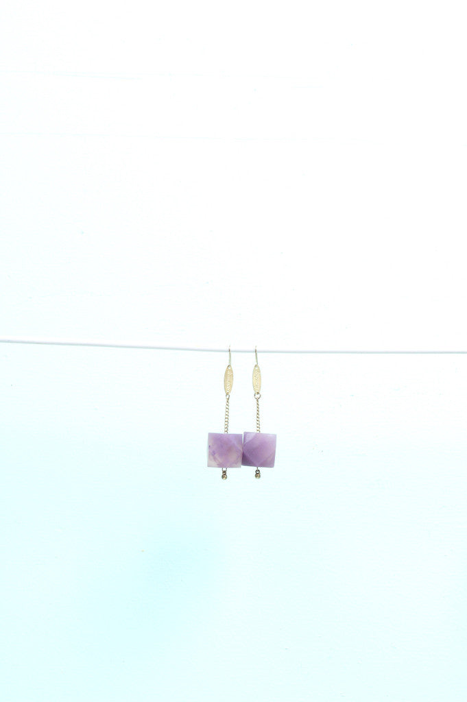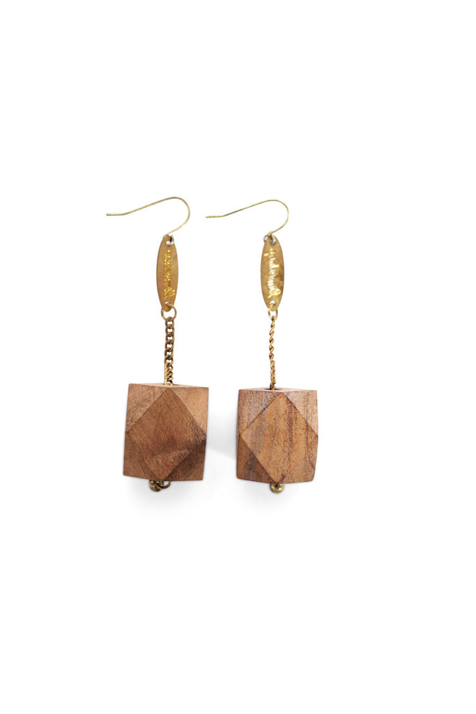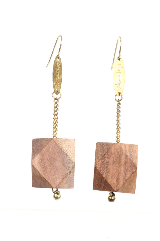 Translucent marbled resin and sustainably-grown Rosewood New Gem Earrings. These light weight hanging earring styles have surgical steel earring hooks, hanging chain/limedrop oval logos and come packaged in a Limedrop gift box.