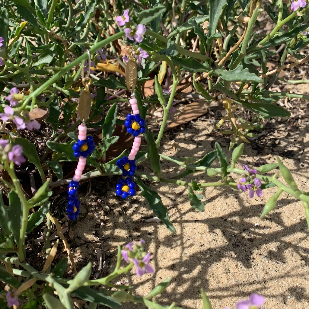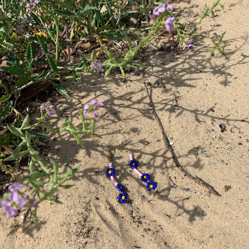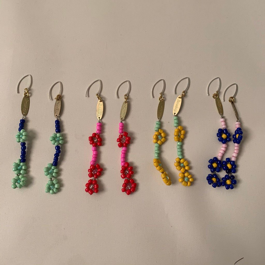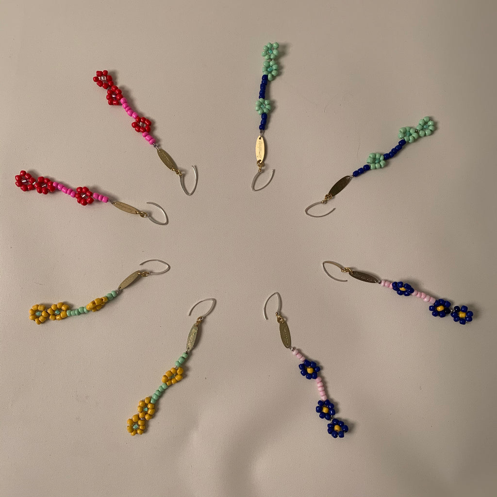 The Daisy Earrings are handmade from glass seed beads in Melbourne, Australia. These elegant earrings feature 16mm sterling silver flat marquise earring hooks, brass Limedrop logo ovals and three daisy designs on a singular strand.
