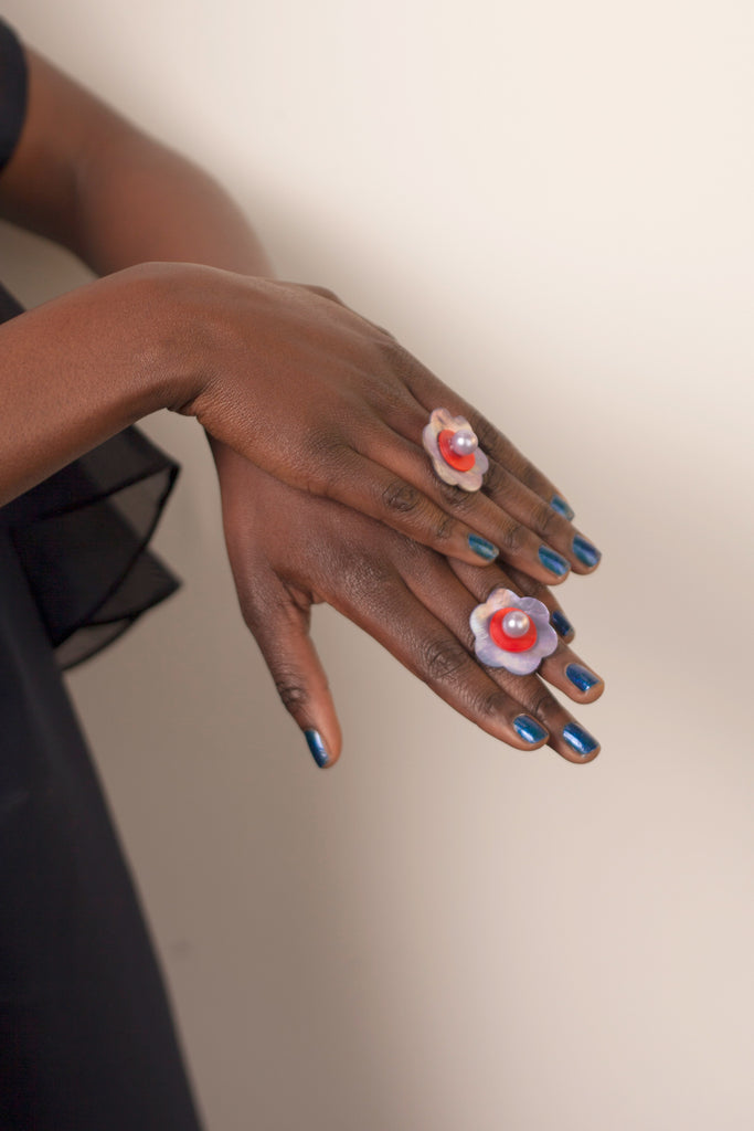 The Flower Pop Earrings are handmade from contrasting lilac and pop red mother of pearl shells with pearl-like centre spheres. They are bold and statement-worthy measuring 34mm across the outer flower, petal to petal.